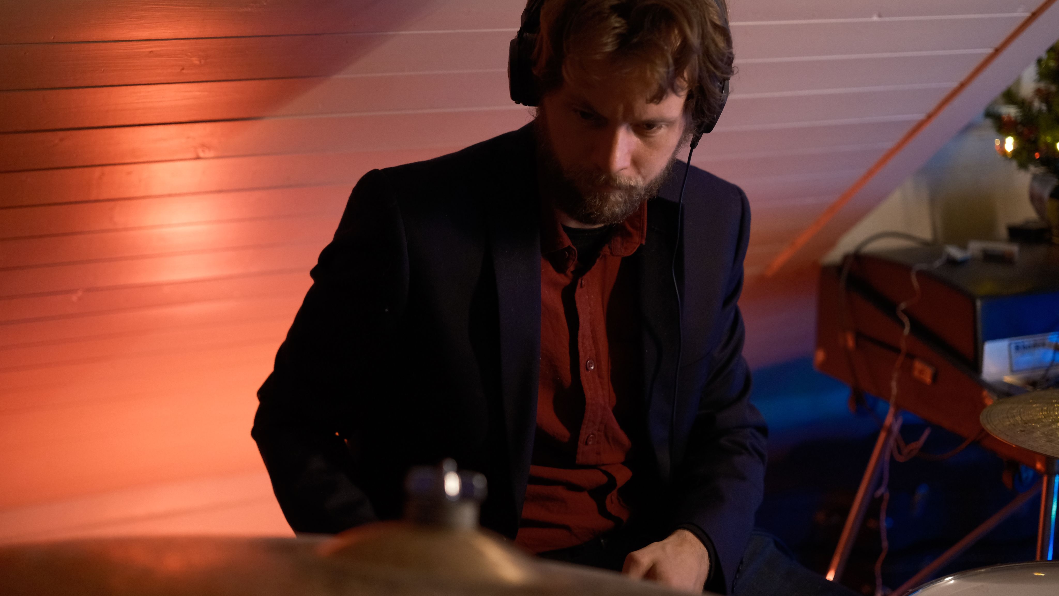 Simon Flatekval briljerer blant anna med paukekøller på trommene.