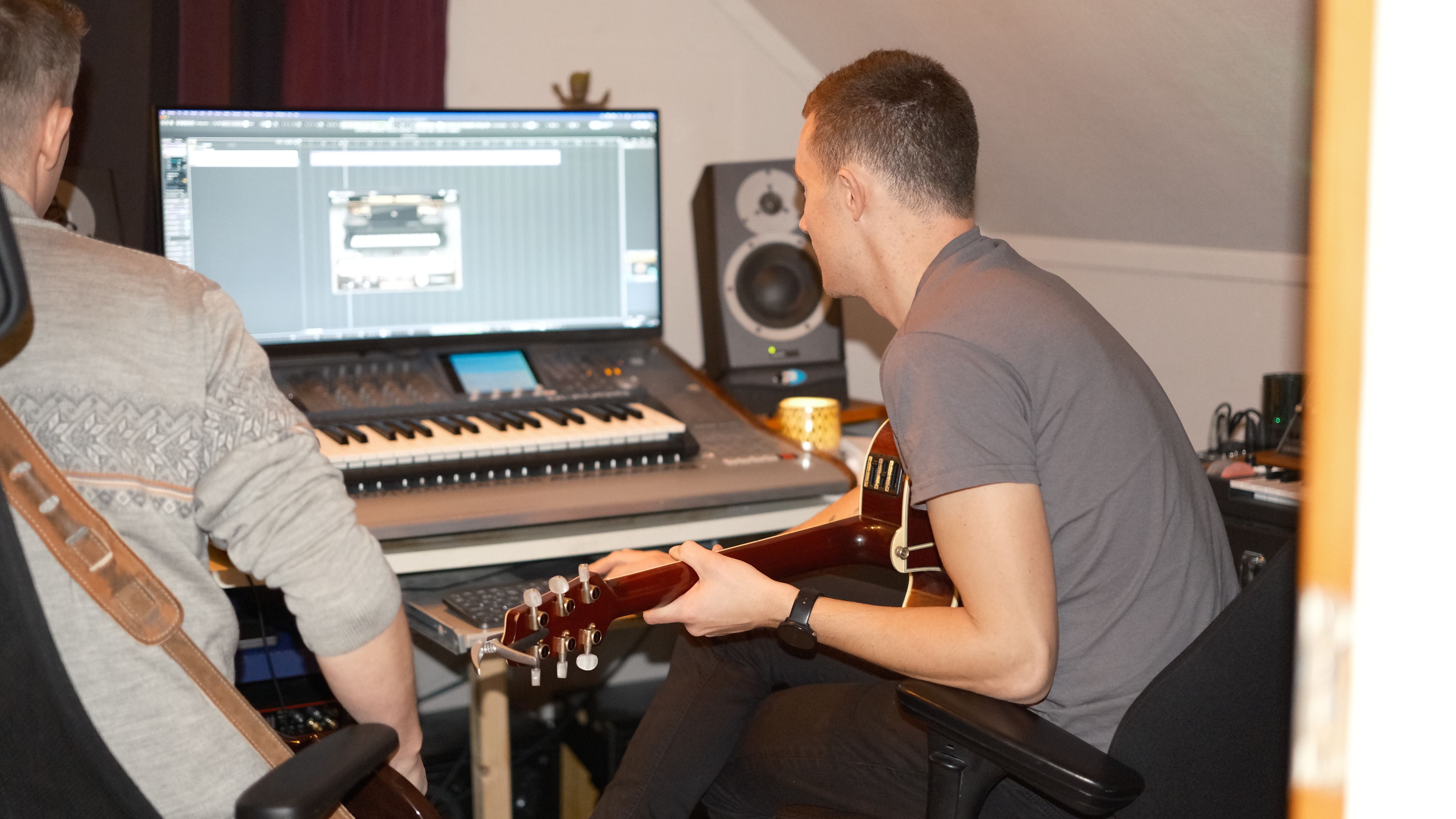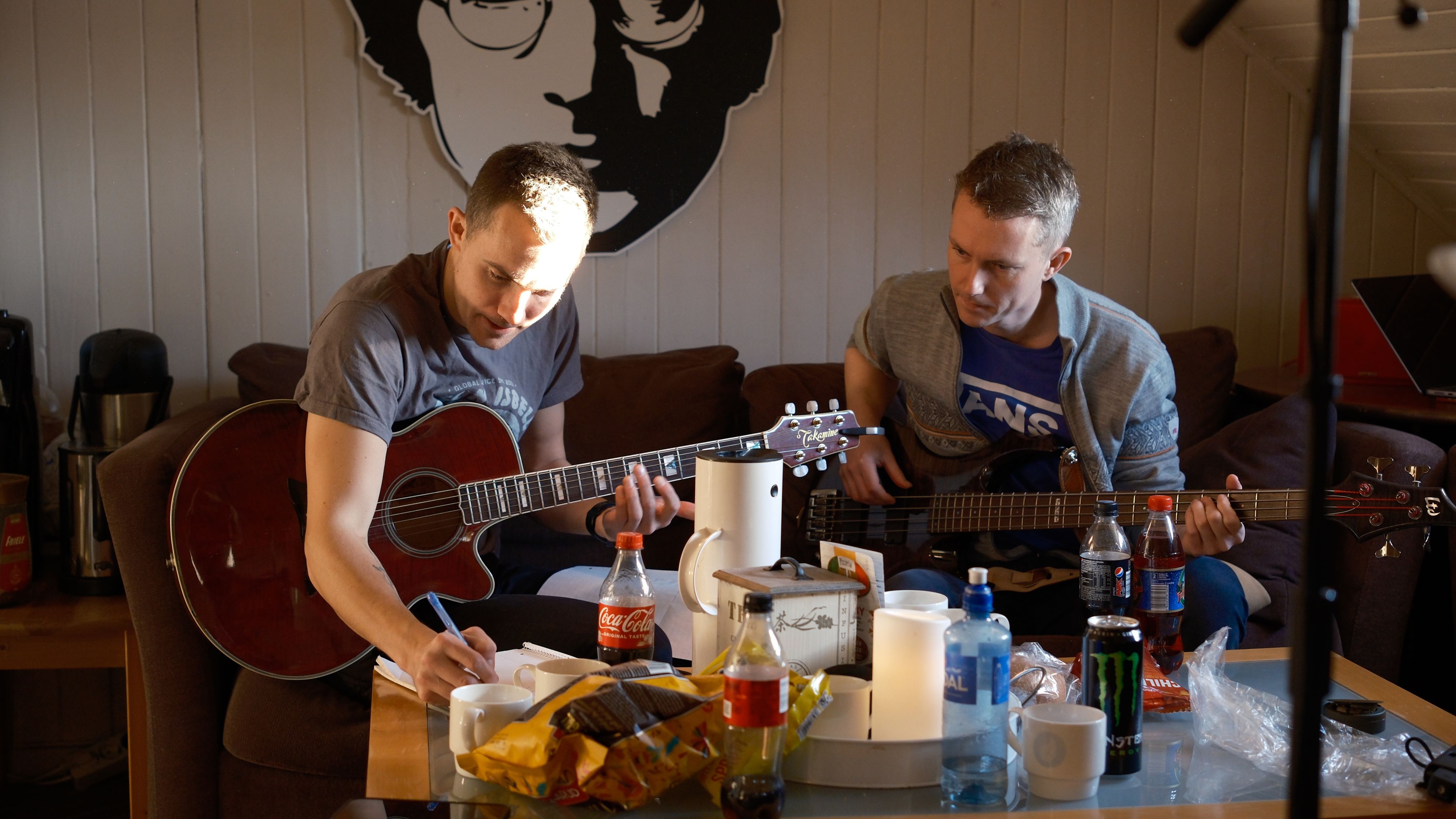 I studio: Her går Øyvind Flatekval (gitar) og Ole Christian Tøsse (bass) gjennom akkorder som skal brukast i sangen.